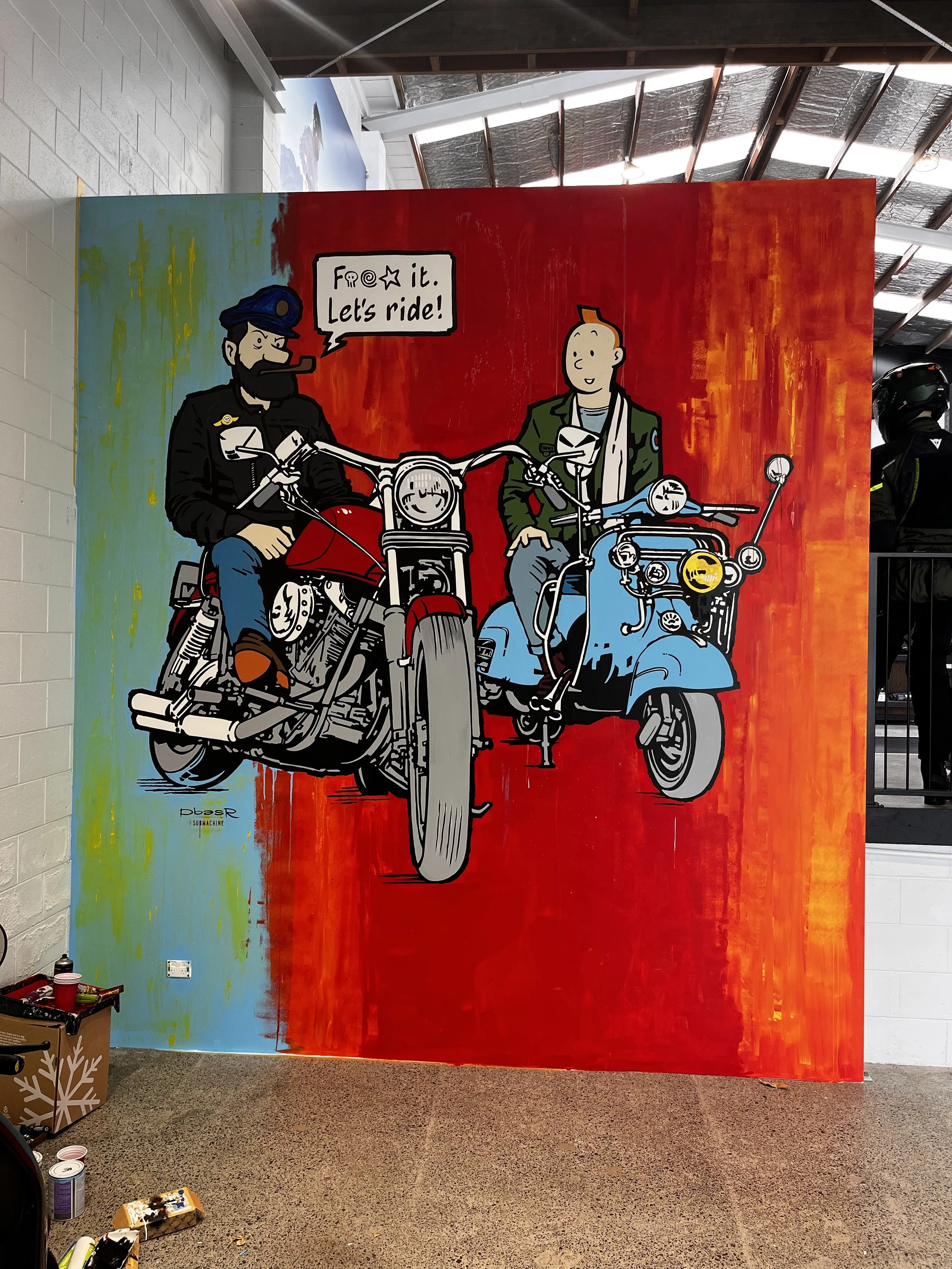 Our illustrator DbasR is normally kept in the basement but he’s occasionally let out to paint on walls. He bloody loves it.